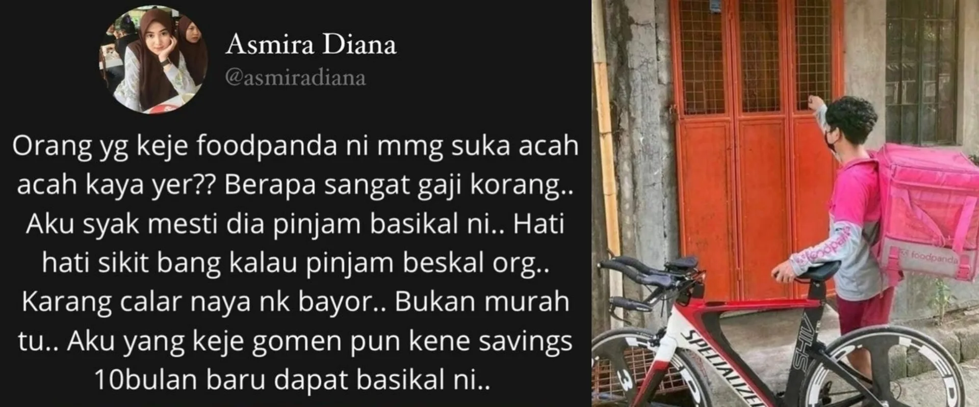 “Why do these Foodpanda riders like to pretend they’re so rich? Their income is not that much. I suspect he just borrowed the bicycle. Be careful if you’re borrowing someone else’s property. If you scratch it, how are you going to pay for it. It’s not going to be cheap. Even I would have to save ten months’ worth of income to buy this bicycle, and I work for the government,” Asmira wrote.