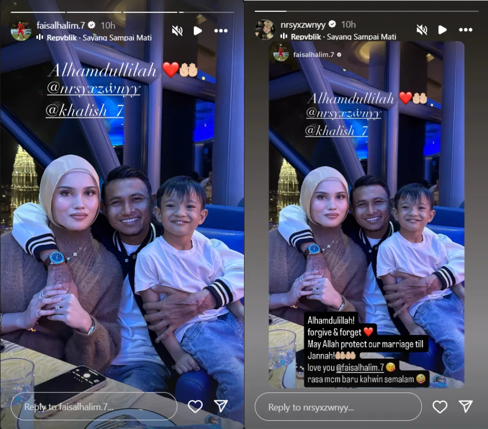In the early hours of 12th September 2025 (Friday), Faisal Halim shared a post on Instagram Stories, hinting that he and his wife, Nur Syazwani Mizuana Shahril, have patched things up and are no longer seeking divorce. The post depicts a photo of the footballer with his arms around his wife and their son, Khalish Aryan. In the photo, the family of three appeared happy, with Nur Syazwani holding onto her husband’s hand.