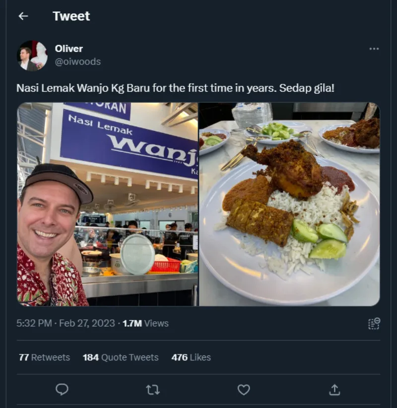 Oliver Woods, founder of Beer Asia, posted two photos on his Twitter earlier this week to share that he went to eat the national dish at Nasi Lemak Wanjo Kampung Baru restaurant in Kuala Lumpur. “Nasi Lemak Wanjo Kg Baru for the first time in years. Sedap gila!” he captioned the post. In one of the photos, the marketing strategist shared the dish that he ate at the restaurant.