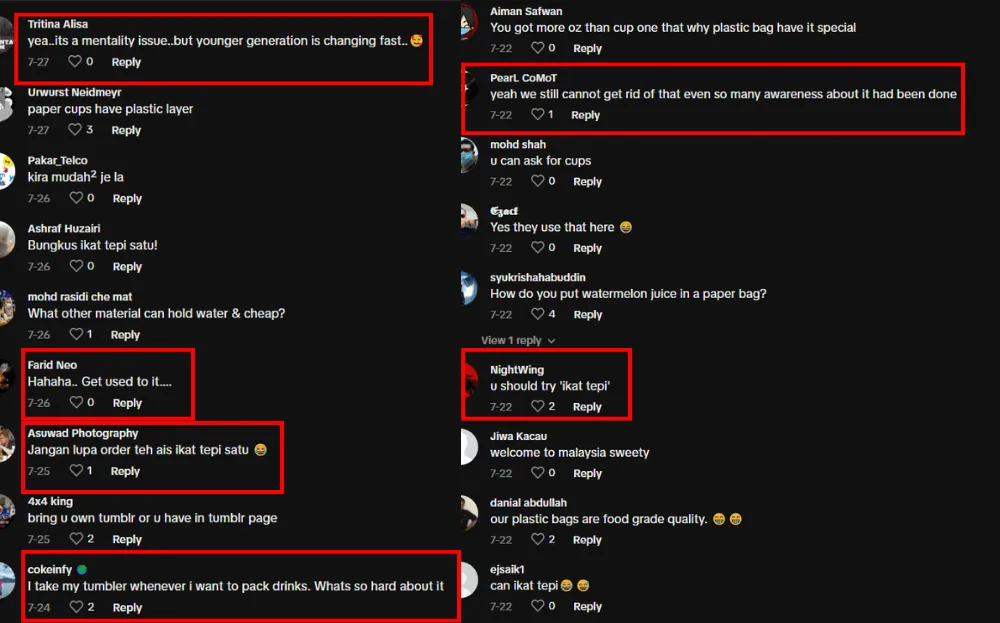 Many Malaysians have chimed in on the conversation about plastic bags, with most seemingly finding no issue with the “ikat tepi” method. However, a few agreed with Nicole’s disapproval of food businesses using single-use plastic but assured that the newer generation of food vendors is moving towards more sustainable practices. Some even suggested the model bring her own container when she goes to get food in the future.