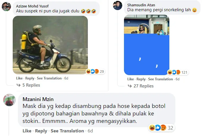 Others joked about the man, teasing that he had indeed gone snorkelling. Another posted a photo of someone who’d worn a similar outfit while riding a bike, saying they suspected it was the same person. One comment pointed out that the bottle was being held near his stockings. “What an amazing aroma,” the Facebook user quipped.