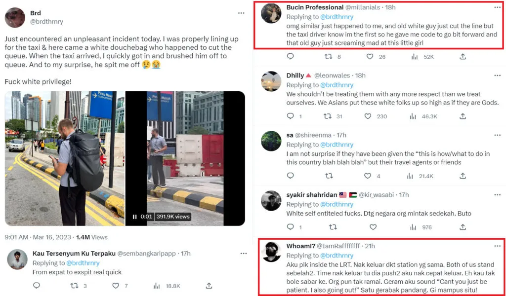 Many sympathised with the netizen, with several being disgusted and upset as well. “(Something) similar happened to me,” one shared. “(An) old white guy just cut the line but the taxi driver (knew) I (was there) first, so he (indicated to) me to (move) forward, and that old guy just (started) screaming (angrily) at this little girl.” Another claimed they had been rudely shoved aside by another foreigner when exiting the LRT.