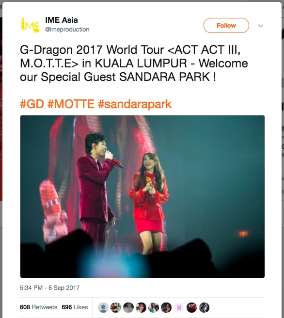 G-Dragon’s 2017 World Tour Act III MOTTE in Kuala Lumpur organiser IME Asia just took to their official Twitter account to confirm that former 2NE1 member Sandara Park (박산다라) will be guest performing at the concert!