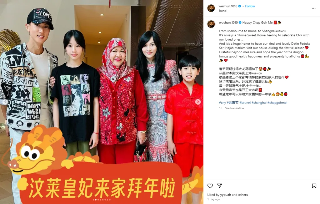 Photos showed the former wife of Sultan Hassanal Bolkiah visiting Wu Chun and family in person for Chap Goh Mei, the 15th and final day of the new year. Datin Paduka Seri Hajah Mariam looked delighted to be there, even taking photos with Wu Chun and his extended family.