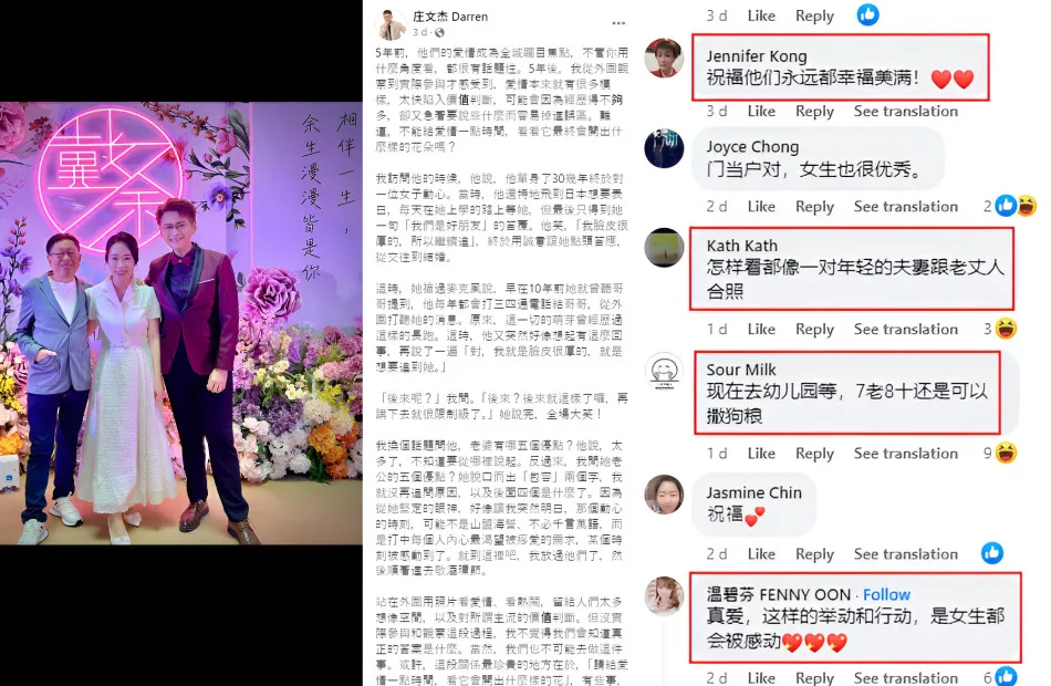 Netizens flooded the TV host’s Facebook post with blessings. One netizen commented, “True love, such genuine gestures and actions would touch any girl.” Meanwhile, some left humorous remarks, “Even in their seventies or eighties, they can still be sweet and display their affection.” However, there were also comments suggesting that “Samantha and Darren look like a young couple taking pictures with their in-laws.”