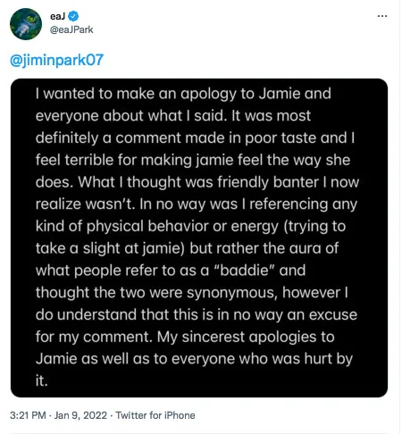 “In no way was I referencing any kind of physical behaviour or energy (trying to take a slight at Jamie) but rather the aura of what people refer to as a ‘baddie’ and thought the two were synonymous, however I do understand that this is in no way an excuse for my comment. My sincerest apologies to Jamie as well as to everyone who was hurt by it,” Jae added in his post.
