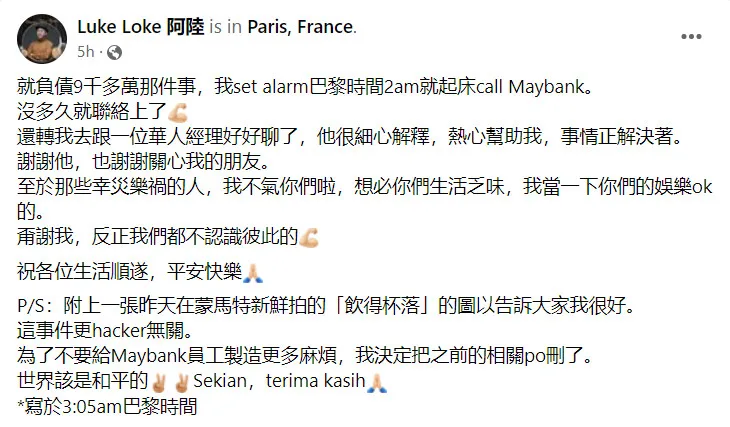 The post has since been removed so as to “not cause more trouble for Maybank employees”. As for Luke himself, he’s currently continuing his Paris tour. We sincerely hope he manages to regain his original balance without much ado!