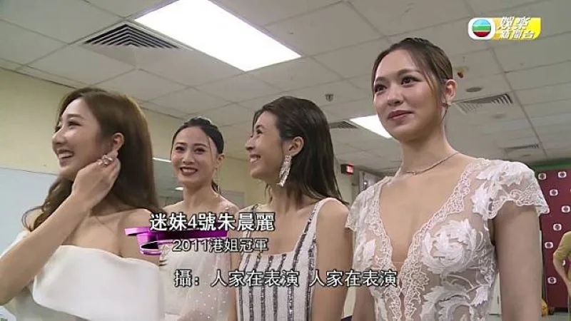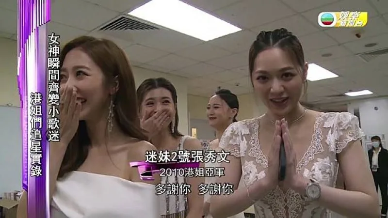 A group of previous Miss Hong Kong champions had gathered to take a photo with the “God of Songs” after his performance. Crystal Fung (馮盈盈) had teamed up with Rebecca Zhu (朱晨丽), runner-up Sammi Cheung (张秀文) and Regina Ho (何依婷) to wait for Jacky in the lobby of the venue, hoping to catch him as he left.