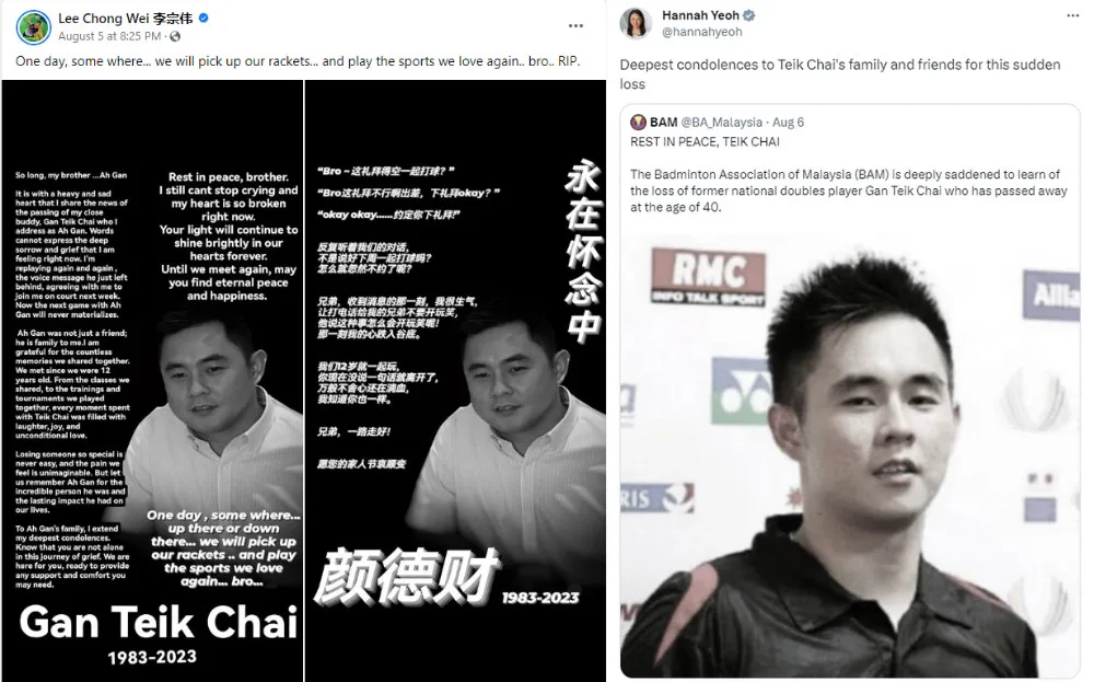 Close friend Datuk Lee Chong Wei posted a tribute to the former shuttler on his Facebook page, saying, “It is with a heavy and sad heart that I share the news of the passing of my close buddy, Gan Teik Chai, who I address as Ah Gan.” The former national shuttler continued to speak of his fond memories with Teik Chai before wishing his condolences to the deceased’s family.