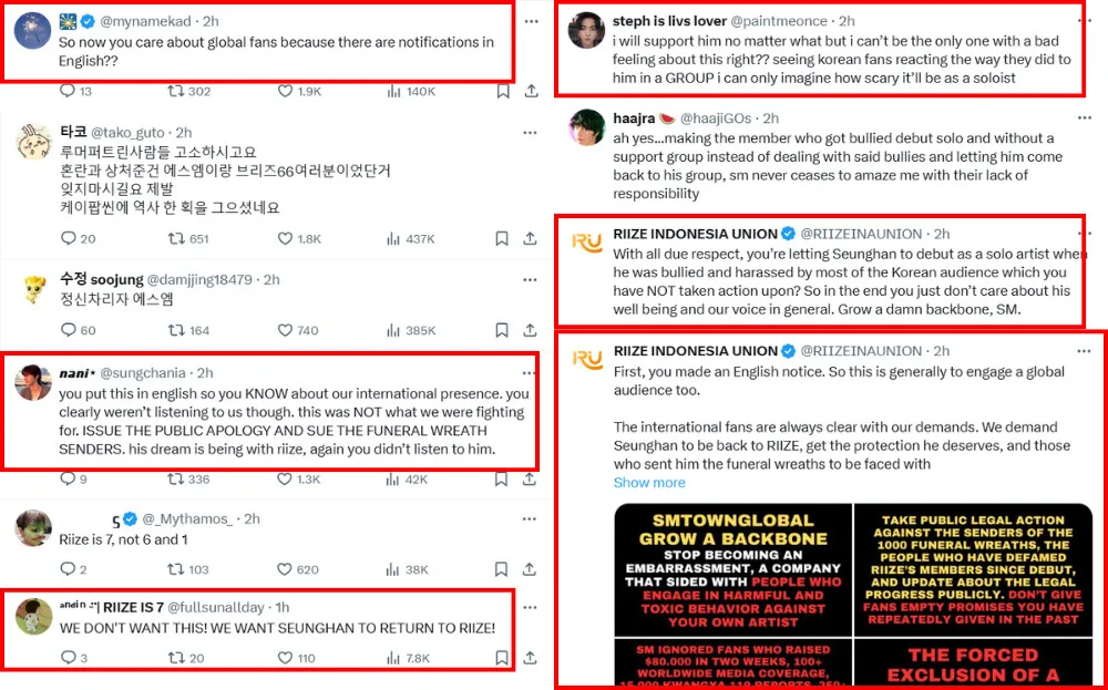 Many also noted how SM Entertainment provided a separate announcement in English, which is uncharacteristic of the company. Many suggest the agency hopes the announcement will attract foreign fans who have been vocally supporting Seunghan since his dismissal while continuing to ignore their demands. Others also argue that the singer making a solo debut may be more detrimental to his mental health, given how netizens treated him while he was in RIIZE.