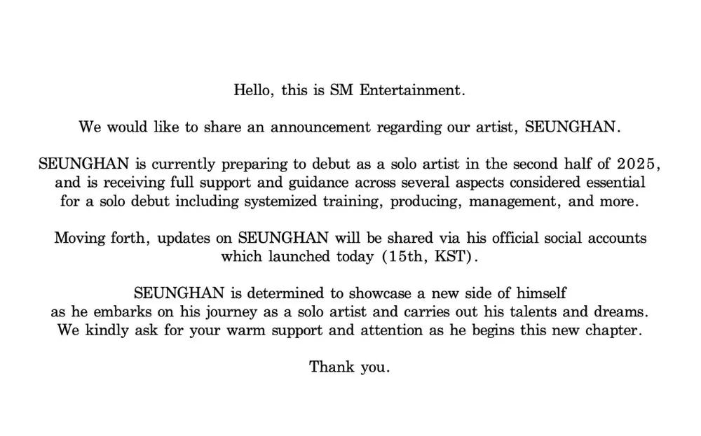 While Seunghan left his group, he remained signed to SM Entertainment, and earlier today (15th November 2024, Friday), the company shared an update on the idol’s solo endeavours. According to the announcement, Seunghan is preparing to debut as a solo artist in the second half of 2025. As part of his solo career, the singer will also launch official social accounts to provide updates on his activities.