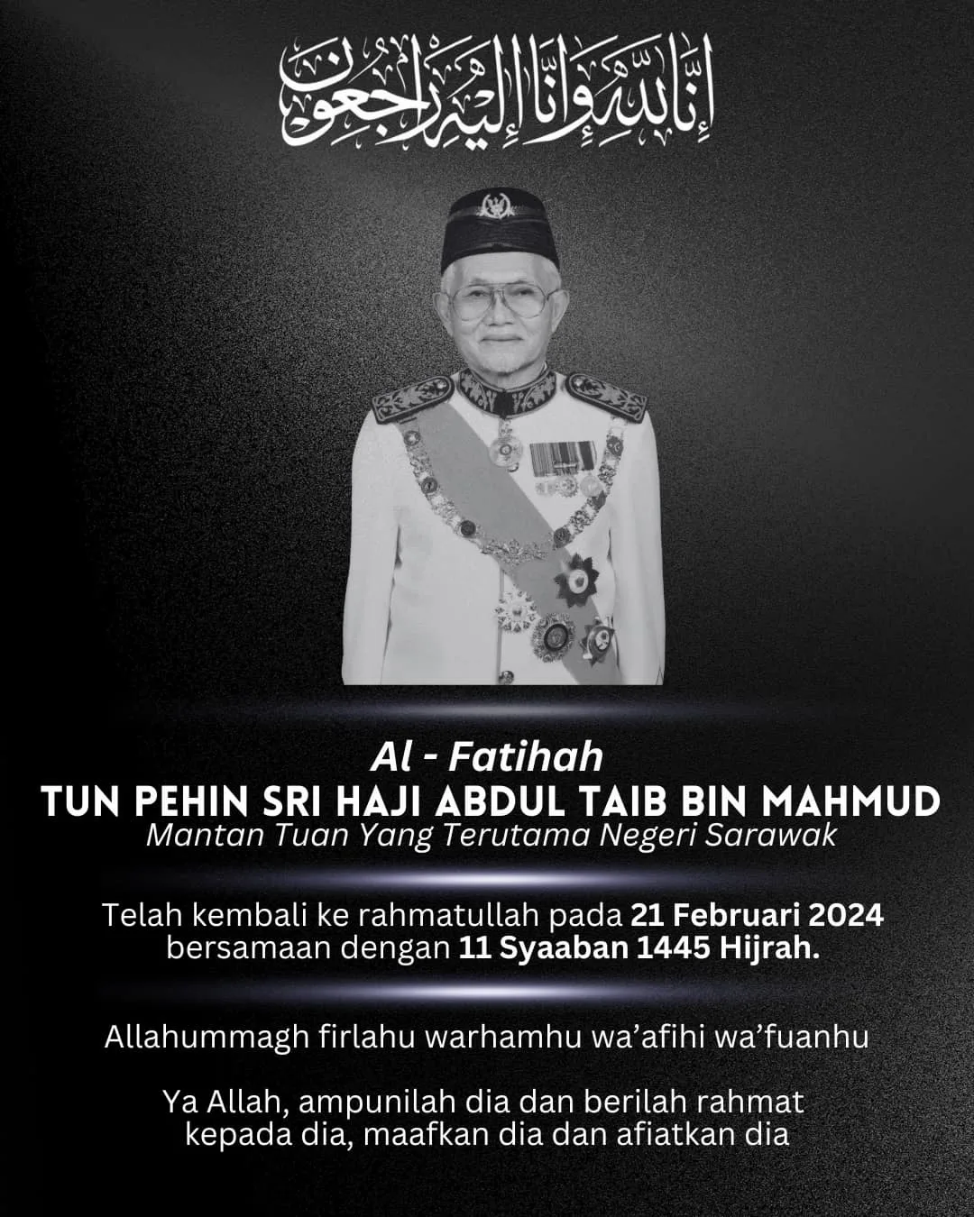Former Sarawak governor Tun Abdul Taib Mahmud has passed away at age 87. The news was conveyed by his daughter, Datuk Hanifar Taib, who confirmed the former governor passed away at 4:28am, Wednesday (21st February) at a private hospital in Kuala Lumpur.