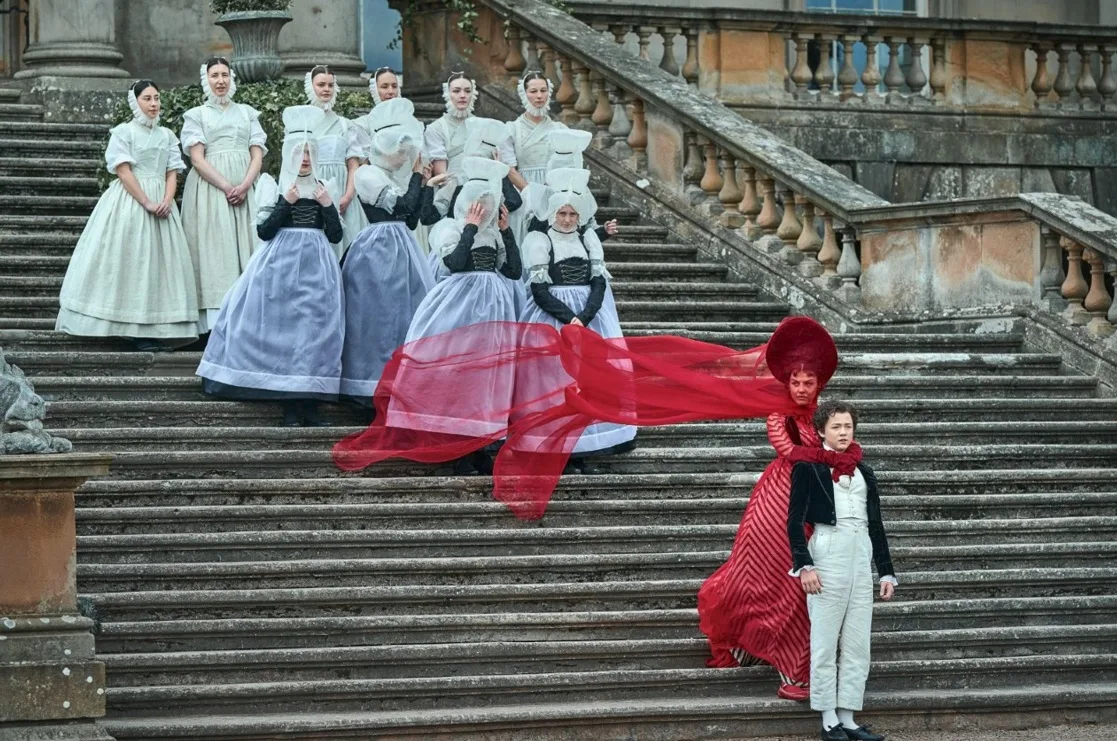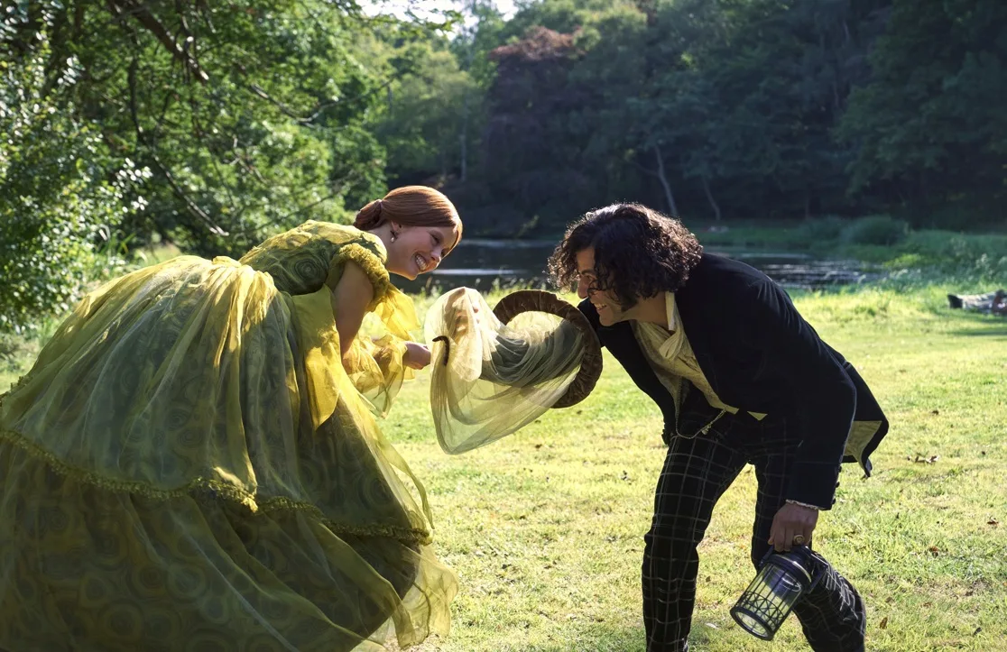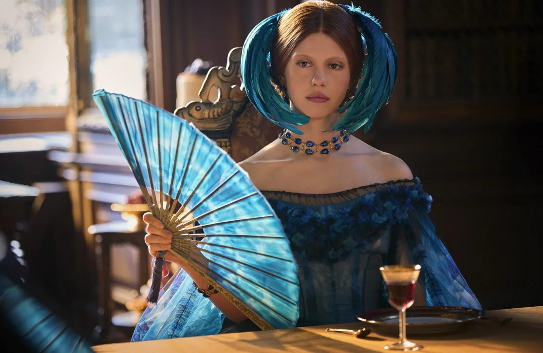 Meanwhile, Mia Goth’s Elizabeth Harlander is quieter than in her previous roles, but she is vital. She serves as both muse and mirror to Victor, embodying empathy, compassion, and restraint amidst chaos. Costume designer Kate Hawley dresses her in jewel-toned creations.