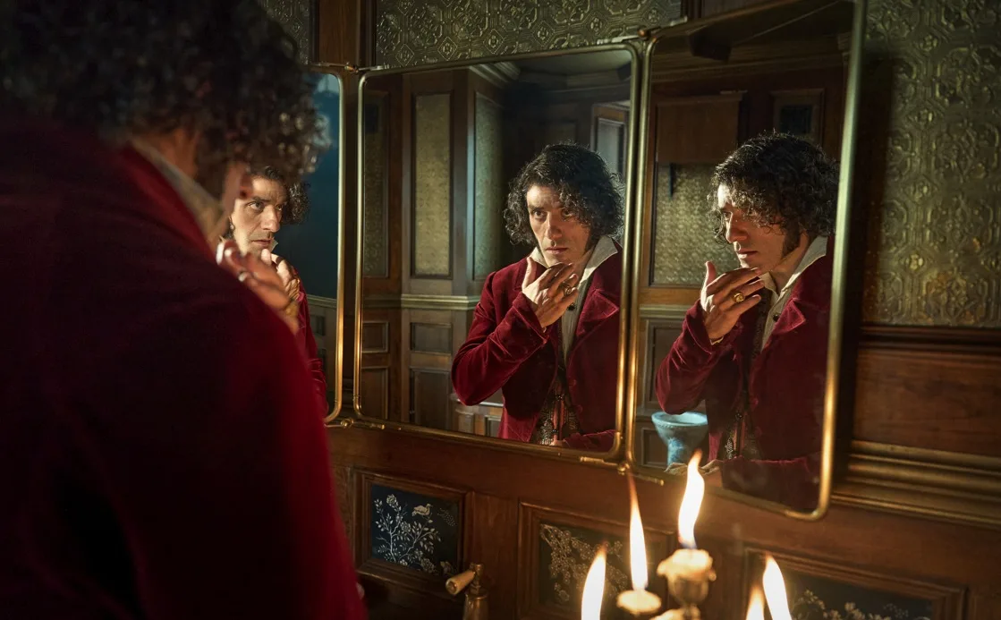 Del Toro’s “Frankenstein” revels in visual and historical texture. From meticulous production design to tactile instruments, frostbitten exteriors, and shadowy tower interiors, the world feels both lived-in and mythic. Costume and set design extend character beyond narrative necessity. Every frame feels deliberate. Every shadow reflects grief. Moreover, every jewel strikes a note in a visual symphony.