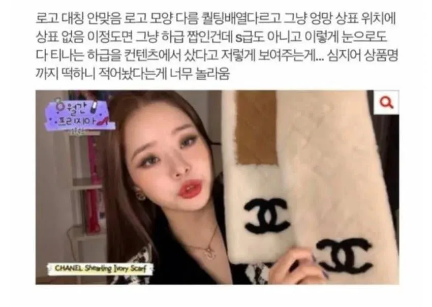 As seen in the photo (attached above) of Free Zia holding the Chanel Shearling Ivory Black Scarf, one netizen pointed out, “The logo position is wrong and the thickness of the logo is different. The tag on the inner side isn’t there also. She created content with fake stuff.”
