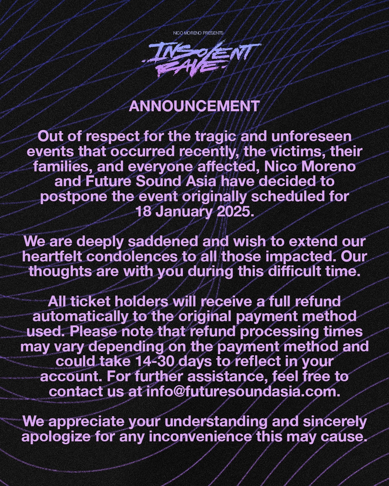 Unfortunately, another upcoming event in Kuala Lumpur will have to be rescheduled following a recent tragedy. Earlier this week, Future Sound Asia issued a statement to inform fans that French DJ Nico Moreno’s Insolent Rave event has been postponed. Here’s why: