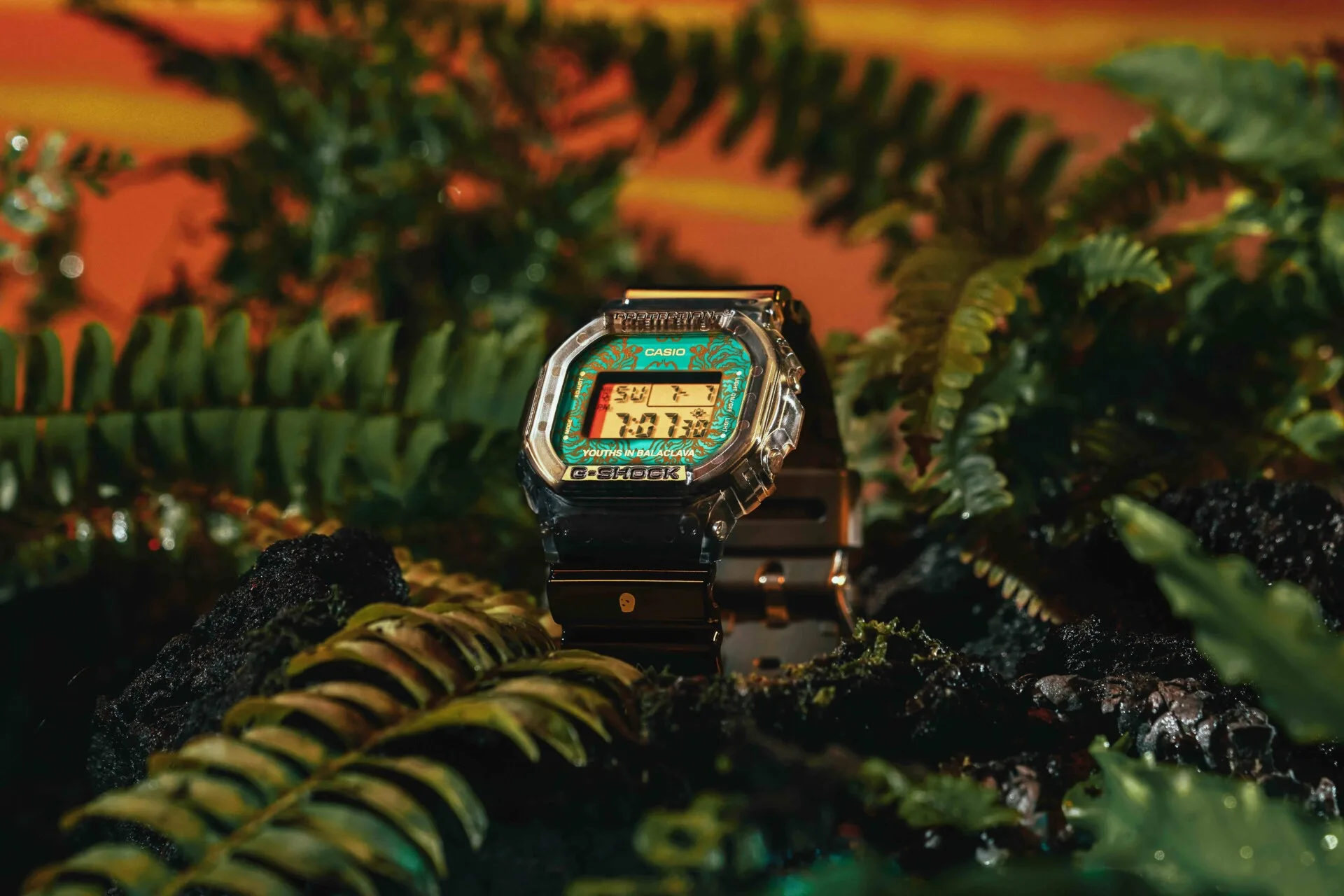 G-SHOCK has welcomed a new model, created in collaboration with Youths in Balaclava, the alternative fashion collective. Boasting a face dressed in jungle green, the base model is the standard digital DW-5600YIB23-8DR. Leafy floral motifs can be found backdropping the written names of CASIO and Youths in Balaclava.