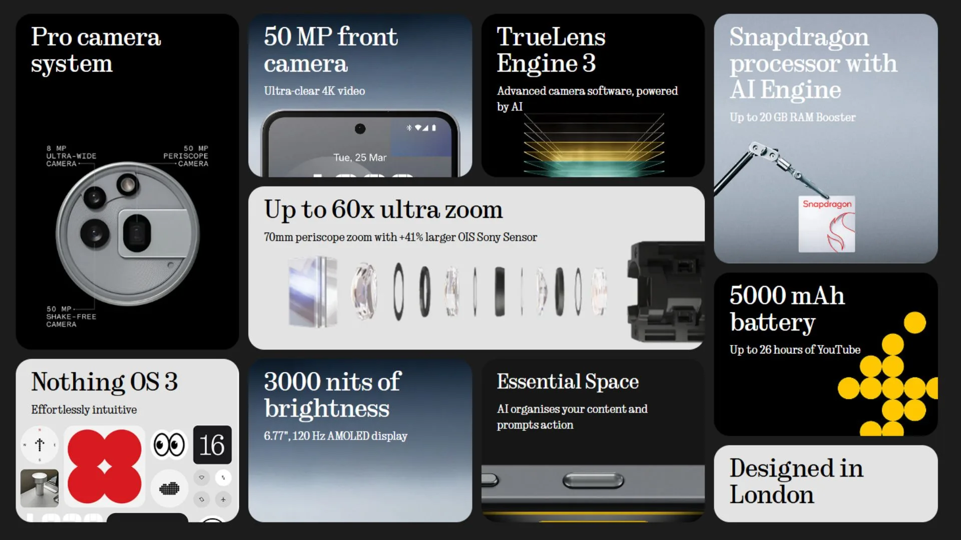 Nothing is a bit of a cheeky company; they really teased and hyped everyone up for their newest releases. These are two mid-range budget phones that punch way above their own weight and probably have the most characterful and unique designs on the market. Nothing has their own unique Android skin with their thoughtful design touches throughout. Both variants are 6.77″ Full HD+ 120Hz AMOLED with 3000 nits peak, powered by Snapdragon 7s Gen 3 paired with 12GB RAM and 256GB. The Pro variant enjoys better camera genetics with the 50MP main shooter, 8MP ultra-wide, and 50MP periscope telephoto. The non-pro version just has a conventional 50 pancake telephoto.
