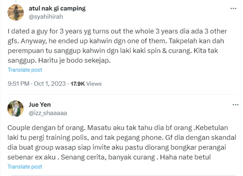 Unfortunately for many Malaysians, their worst dating experience involved cheaters, like one user who said she dated a man for three years, only to find that he had three other girlfriends that whole time. Another woman said she unknowingly dated a man who already had a girlfriend and a side chick. She added that all three girls ganged up to expose the man of his cheating ways.