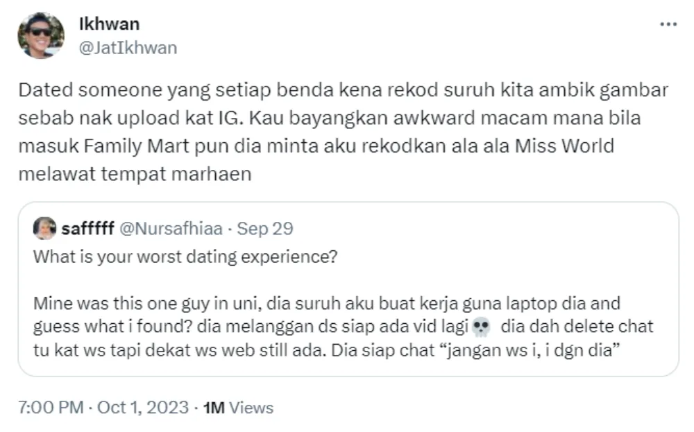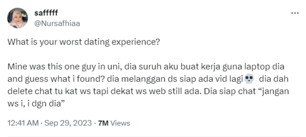 No one said dating is easy – and, admittedly, finding the right one takes time. Unfortunately for some, the more people they meet, the more push back they have to endure. Twitter user @/Nursafhiaa brought up the topic of dating when she asked netizens about their worst dating experiences.