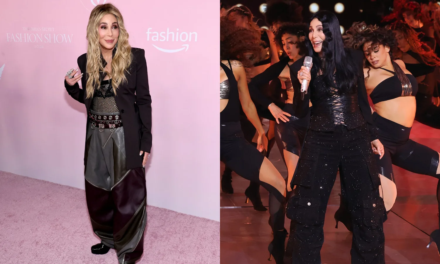 The legendary singer-actress debuted her blonde hair on Victoria’s Secret Fashion Show’s “pink” carpet last night. She spotted a netted Off-White bodysuit that was covered in crystals, which she paired with baggy trousers and a blazer from The Attico’s Spring 2025 collection. She completed the look with layered belts, square-toe boots, statement earrings, and rings.
