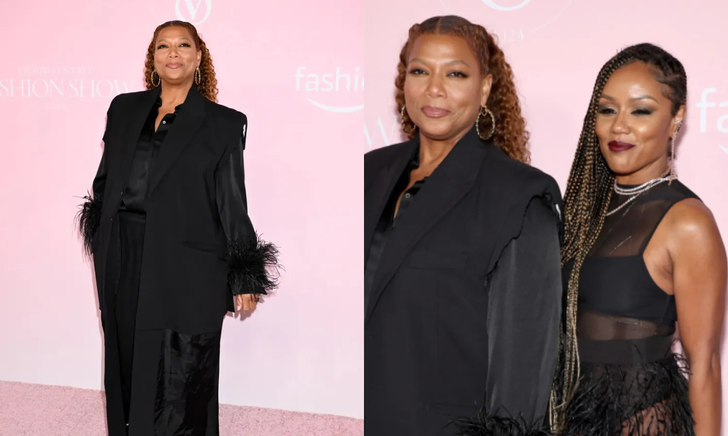 Queen Latifah and her partner Eboni Nichols matched each other with a monochromatic look on the pink carpet. The rapper, singer, and actress wore a sleeveless coat, layering it over with a satin blouse that featured feathered cuffs. She paired her top with striped trousers, leather shoes, and gold hoops.