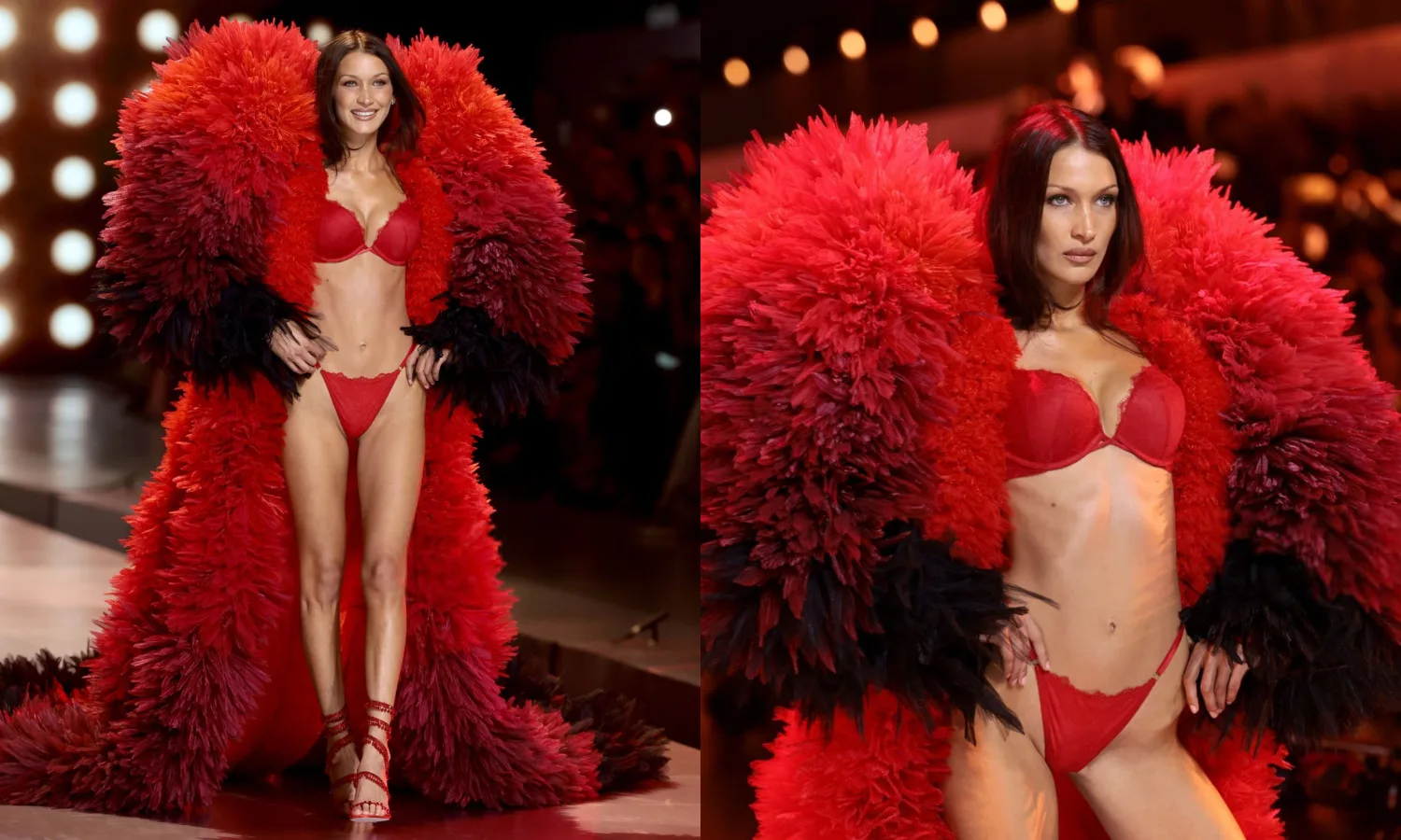 Despite being on a modelling hiatus to focus on her health, Bella Hadid made an unexpected return on the runway of Victoria’s Secret Fashion Show. The younger Hadid sister wore a lacy red-hot bra and underwear set, paired with strappy heeled sandals.