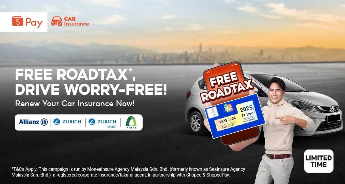 Did you know ShopeePay can help you out when it comes to your daily drive as well? By purchasing car insurance in the ShopeePay app, you can snatch up a free road tax for a limited time—no minimum spend required.