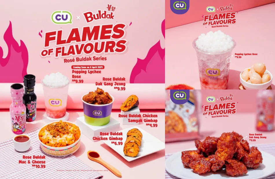 For cheese lovers, Rose Buldak Cheese Baked Rice features chicken chunks with macaroni, corn, and gooey cheese. CU’s Dak Gang Jeong (fried chicken) gets a spicy upgrade with Samyang’s Buldak sauce and melted cheese. Refresh with Lychee Rose sparkling soda or Popping Lychee Rose with yoghurt pearls. Experience CU x Samyang – where fire meets flavour – at your nearest CU store!