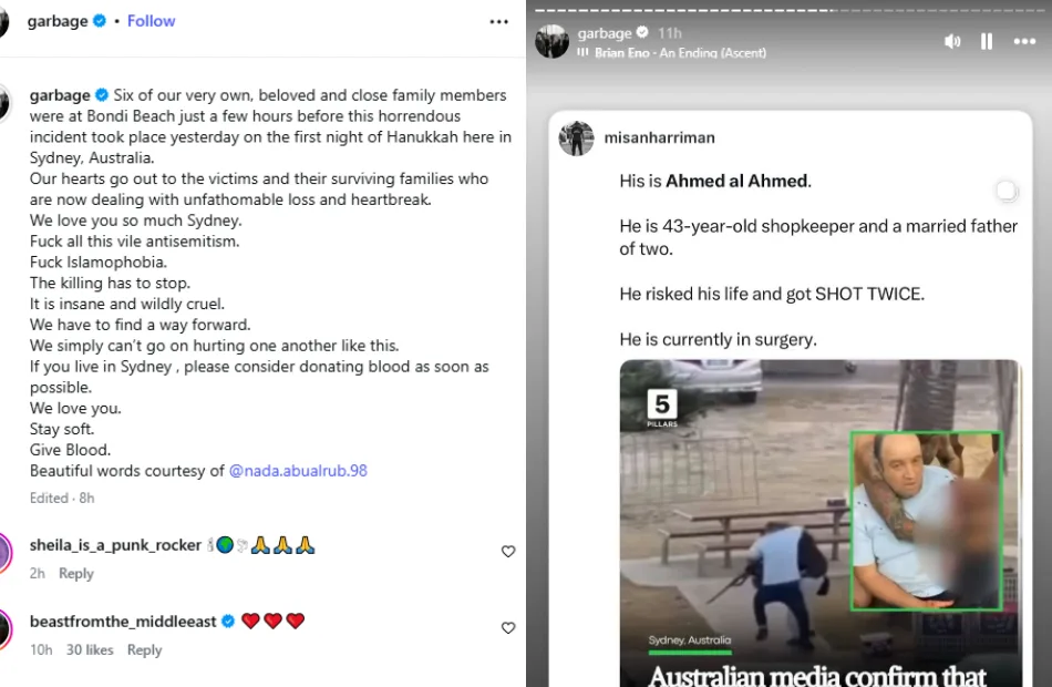 Upon learning of the attack, they reposted Australian doctor, Nada Abu Alrub’s IG post, paying tribute to the victims and urging against hatred towards Muslims, who have since been unfairly blamed in connection with the incident. The rock stars also shared news about Ahmed el Ahmed, the man who bravely disarmed one of the shooters.