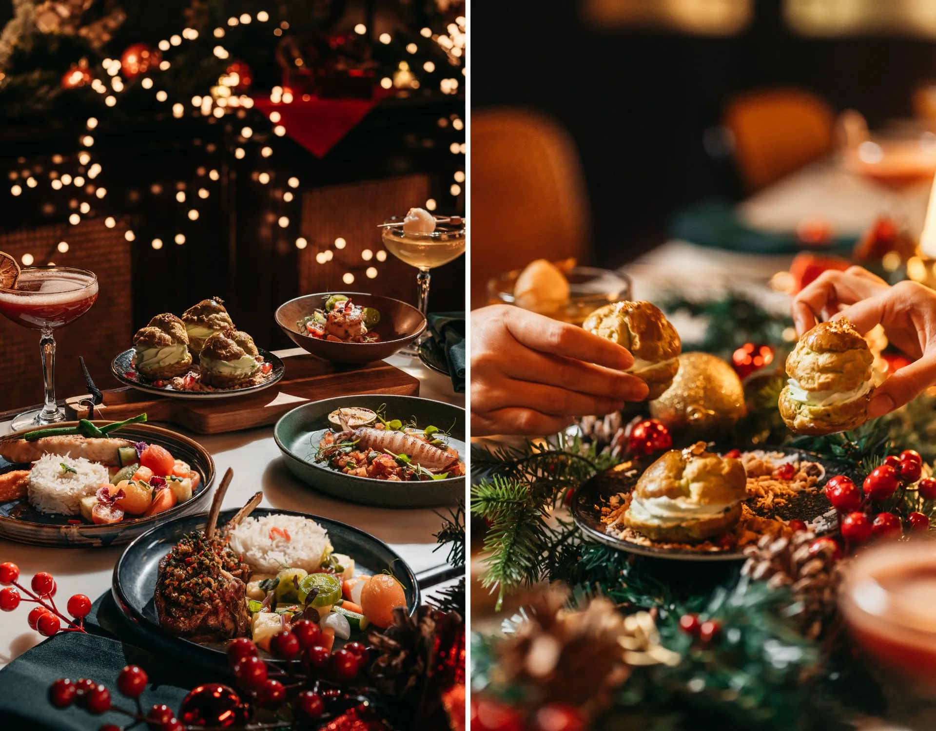 Start your feast with Charcoal-Grilled Baby Squid, perfectly smoky and paired with a tangy sambal salsa, followed by a vibrant Scallop and Herb Kerabu Salad that’s light, aromatic, and packed with fresh herbs. The mains offer a choice between the tender Sous-Vide Lamb Rack or the Grilled Snapper served alongside nasi dagang, pickled acar, and sambal chimichurri. To end on a sweet note, the Pandan Profiteroles with creamy pandan custard and caramelized coconut provide a tropical twist to classic holiday indulgence.