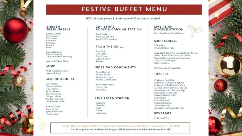 - Price: RM250++ (Festive Feasting Menu), RM380++ (Roasted Leg of Lamb)