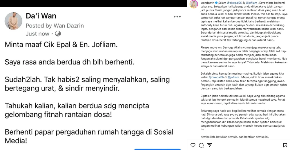 Celebrity preacher Da’i Wan penned a lengthy open letter to Cik Epal and Jofliam on Instagram, urging the two parents to end their public dispute. “Please settle this in private. Don’t be the cause of slander, and don’t commit any more sinful acts that you’ll be punished for in the afterlife. Please, this has to stop,” he wrote. The public figure advised the former couple to take a step back from social media and move on before the situation escalates further.