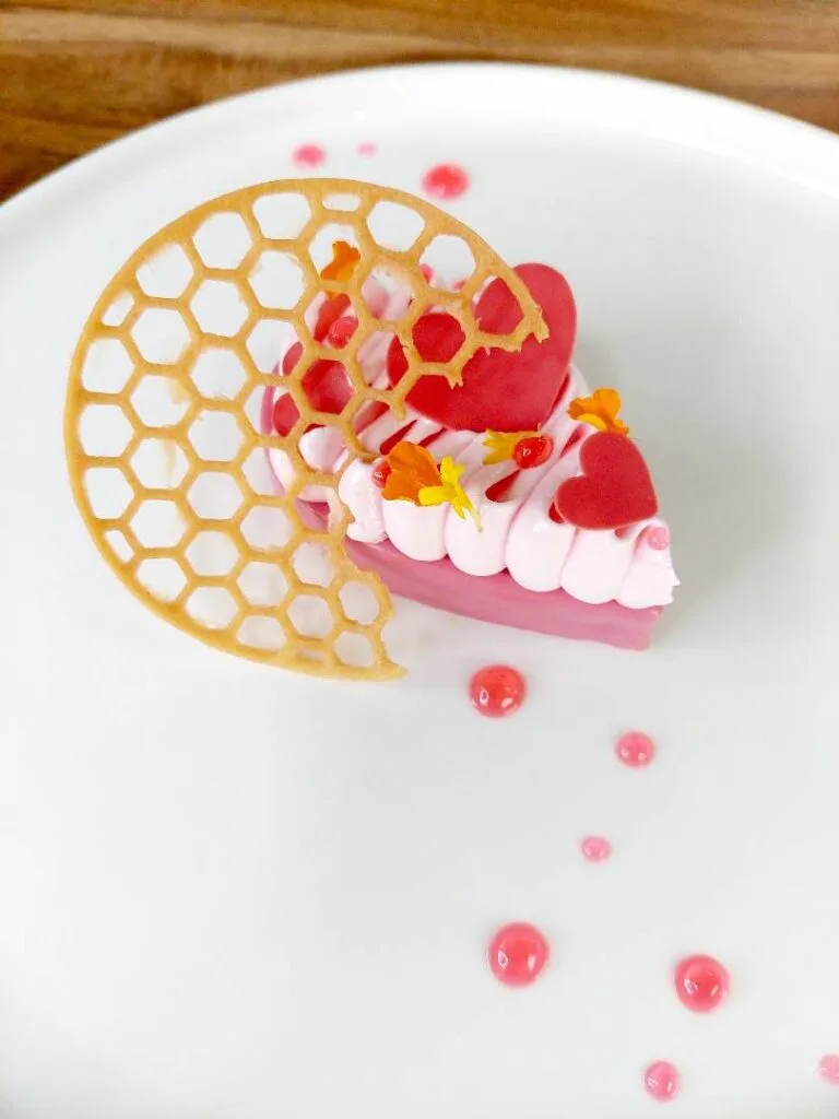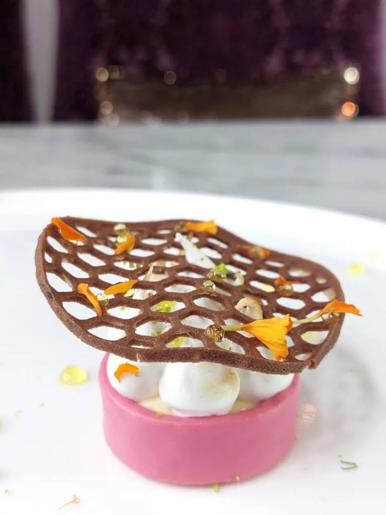 This Michelin Select establishment is offering a platter of love that features a delicate Strawberry Meringue Tart with a honeycomb tuile. This scrumptious delight has strawberry jam and crémeux and fresh strawberries nestled in a strawberry chocolate shell and topped with Italian meringue.