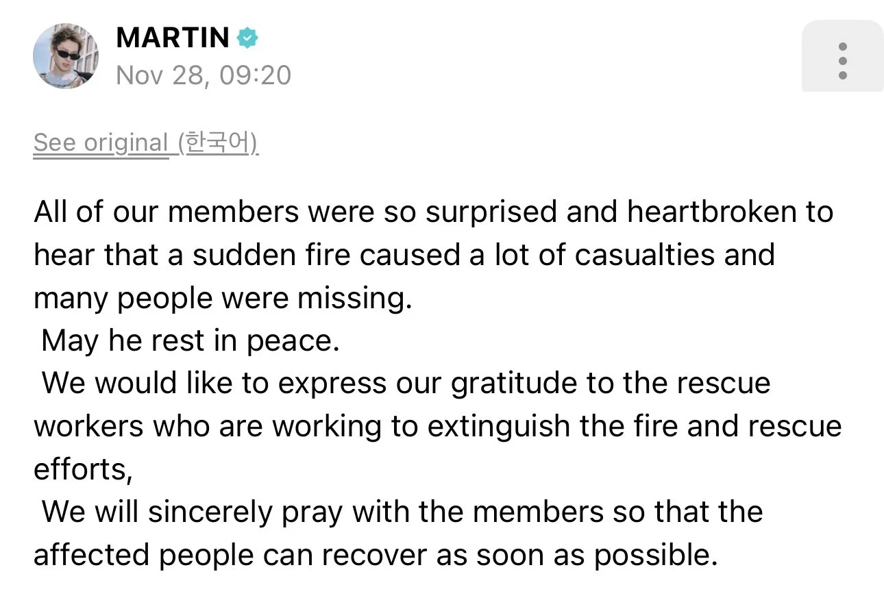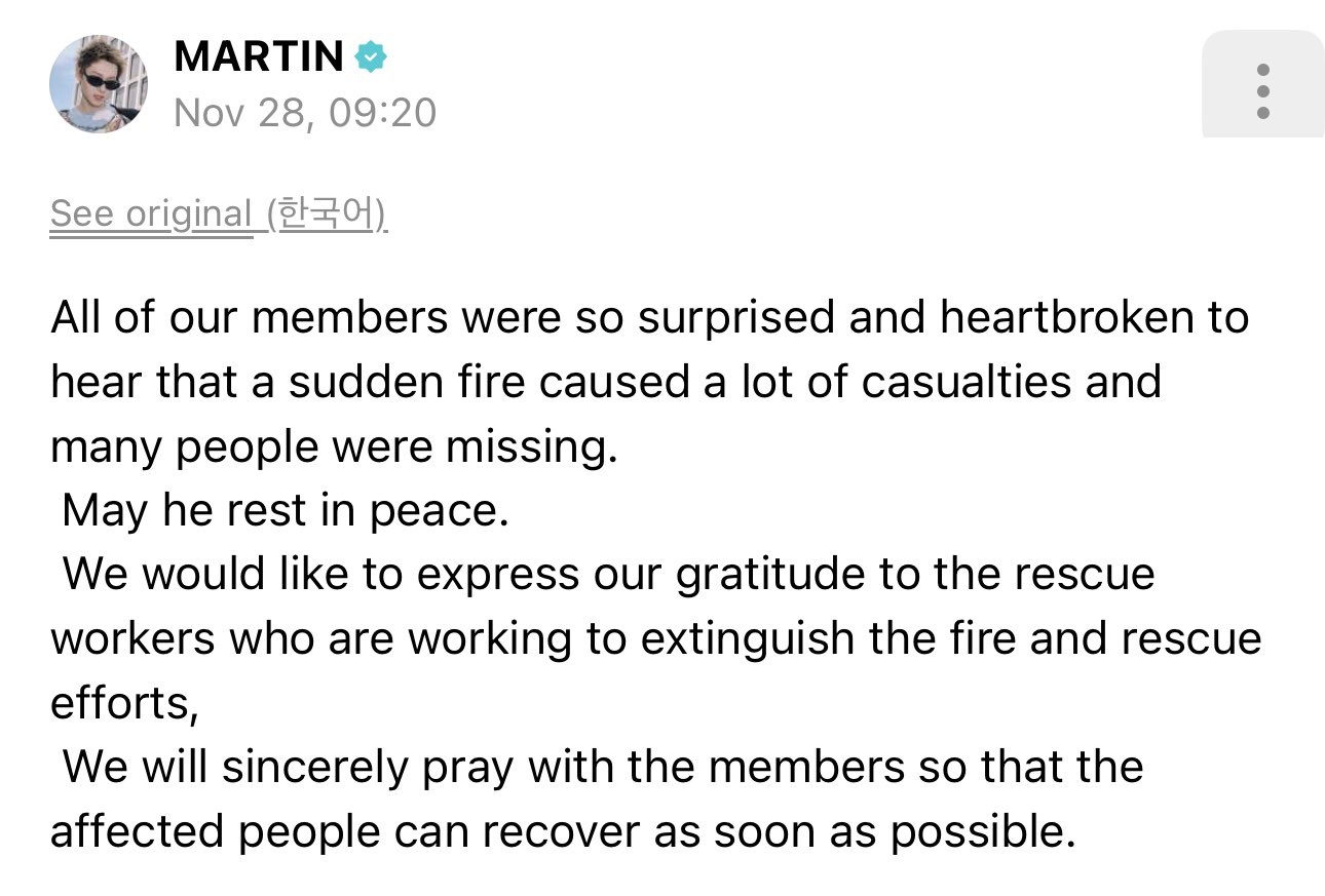 Martin also took to his own social media to express his and his members’ grief over the tragedy. “We were shocked and heartbroken to hear that the fire had caused numerous casualties and left many people missing. We sincerely pray that those affected will recover from this,” he said.