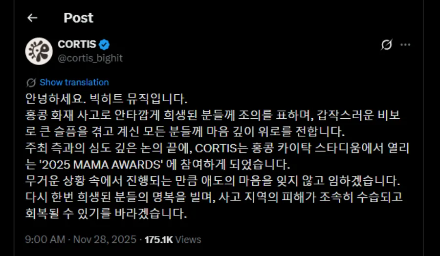 In a statement released by Big Hit Music, CORTIS and their agency expressed their deepest condolences to the families who have lost their loved ones in the fire. “Following in-depth discussions with the [MAMA Awards] organisers, as it is taking place amid such a heavy situation, we will approach it without forgetting our sense of mourning. Once again, we pray for the eternal peace of those who have passed away, and we hope that the damage in the affected area will be swiftly addressed and repaired,” the statement reads.