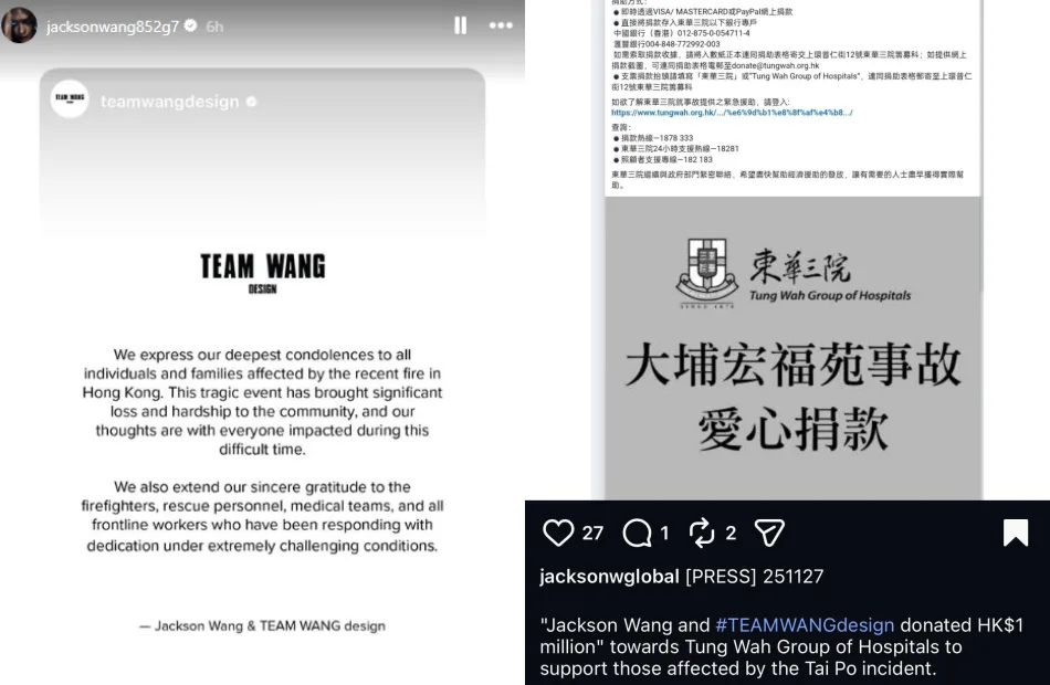According to several Jackson Wang fan clubs, the singer and his clothing brand have donated HK$1 million (approximately RM530,712.60) to the Tung Wah Group of Hospitals’ Emergency Assistance Fund. The contribution will help provide urgent support to those affected by the recent deadly fire.