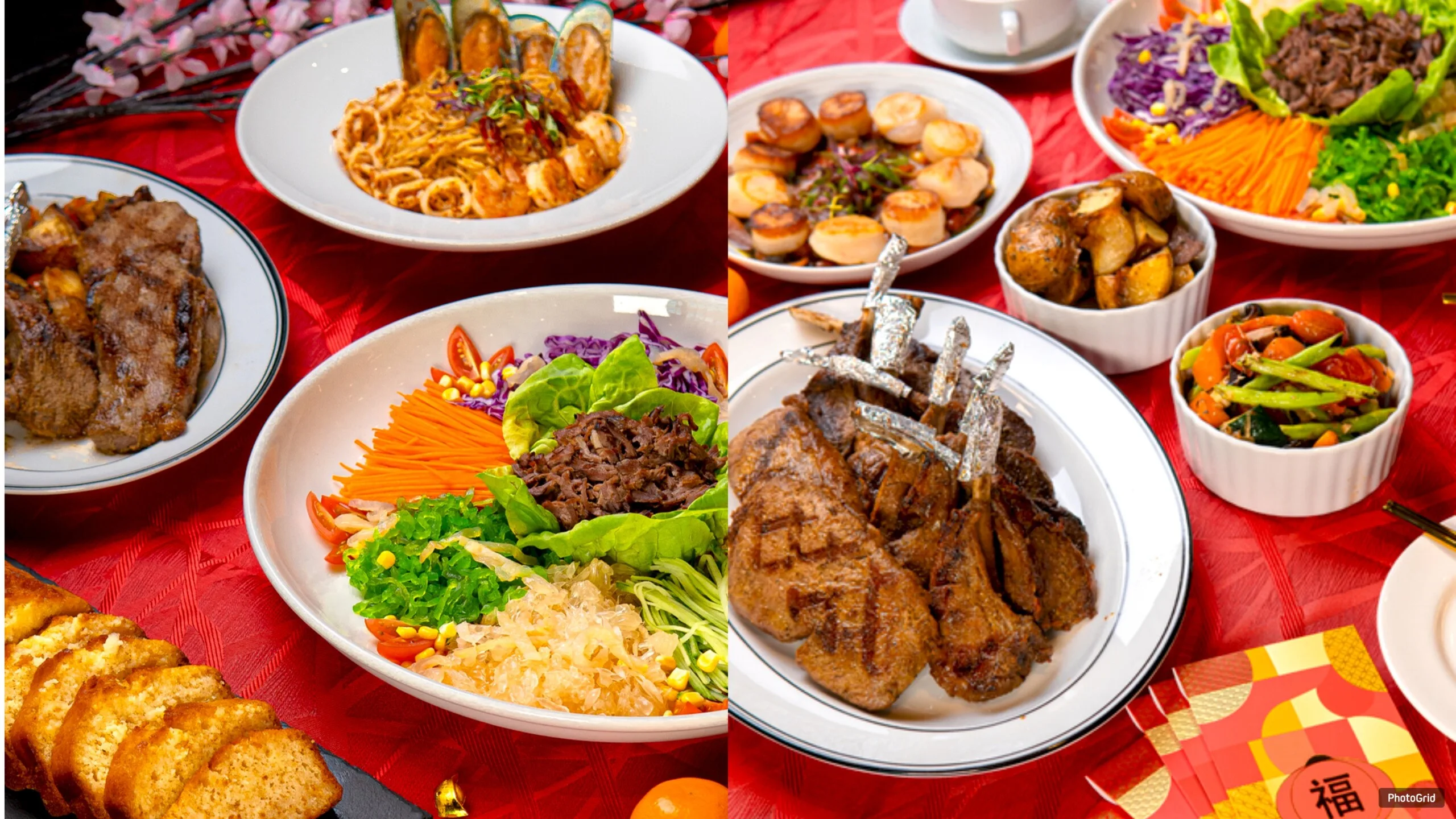 For the mains, the Abundance Sets offer two delightful options: meat or seafood. The Abundance Meat Set features Argentinian Striploin and New Zealand Lamb Cutlets, an ideal choice for meat lovers. Meanwhile, the Abundance Seafood Set boasts Grilled Salmon and Garlic Butter Prawns, symbolising abundance and joy. Both sets also include Spaghetti Aglio Olio (Seafood) and conclude with a scrumptious Pineapple Loaf for a touch of “ong” to end the meal on a sweet, auspicious note.