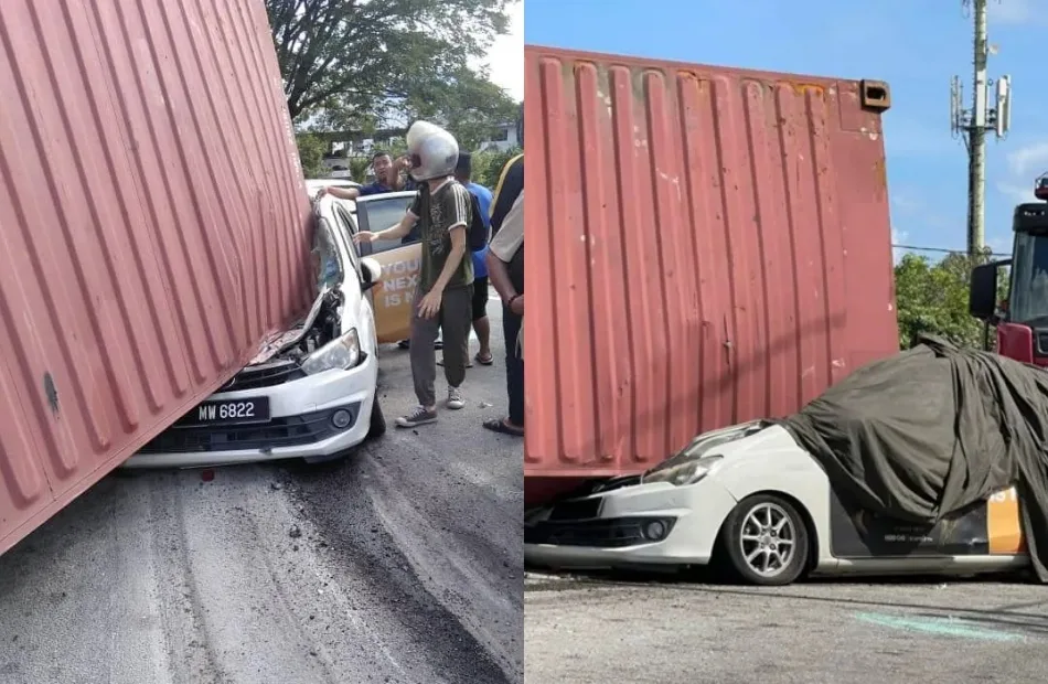 Possibly one of the most tragic accidents this week. It was reported that a woman died on the spot after being crushed by a large container that had toppled over from a lorry. The accident, which took place near Bukit Tengah, Penang, occurred when the lorry made a sharp left turn, causing the container to detach and fall onto the driver in the car. The lorry driver is reportedly remanded for 4 days.