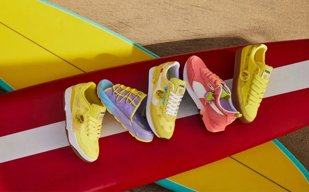 Featuring designs for both adults and kids, the collection includes a special suite of PUMA sneakers paying homage to SpongeBob and Patrick. Footwear highlights include the Suede, Slipstream, RS-Slide, Future Rider, and others that are elevated with SpongeBob detailing, while Patrick Star gets his own version of the Rider FV.