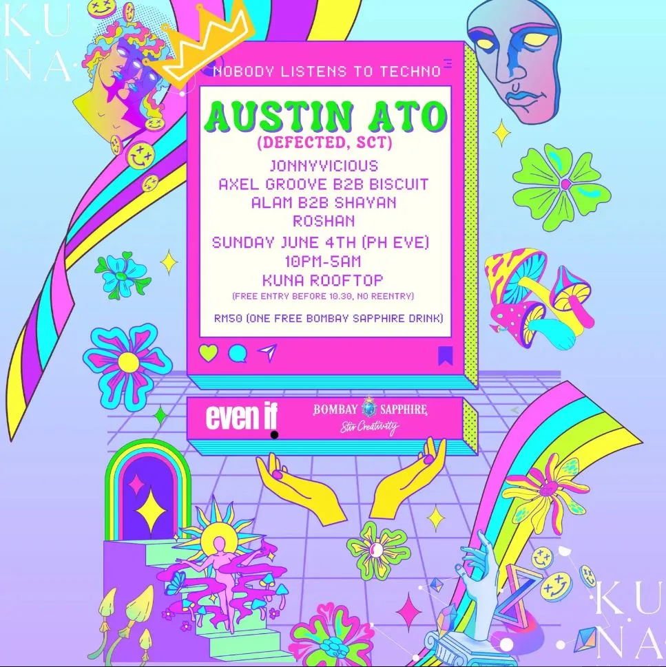 Presented by Nobody Listens To Techno, party till you drop this public holiday eve at Kuna Rooftop with the one and only Austin Ato, as well as the hottest DJs in KL like Jonnyvicious, Axel Groove B2B Biscuit, Alam B2B Shayan and Roshan! On from 10pm to 5am, free entry will be provided before 10.30pm. Entry price is RM50, with one free Bombay Sapphire Drink!
