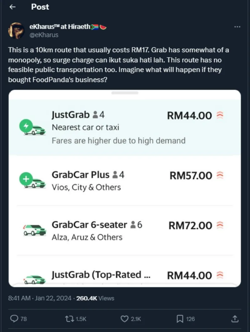 Yesterday (Monday, 22nd January), a netizen who goes by @/eKharus posted a screenshot of the Grab fare that they recently booked, claiming that the company is manipulating the fares. “This is a 10km route that usually costs RM17. Grab has somewhat of a monopoly, so they can surge charge however they like,” they wrote. The user also added the route they were taking had no feasible transportation.