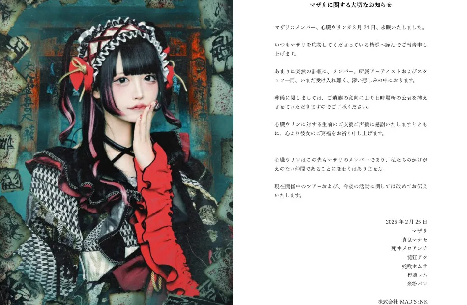Seven-member Japanese idol group Mazari has announced the passing of member Kokoro Urin via their official Twitter account. The singer died the day after revealing she would be taking a hiatus due to a spinal injury. Mazari expressed their sorrow at the loss of their member and thanked fans for their overwhelming love and support for Urin over the years. The group also stated that, in line with the wishes of Urin’s family, details of the funeral would not be made public.