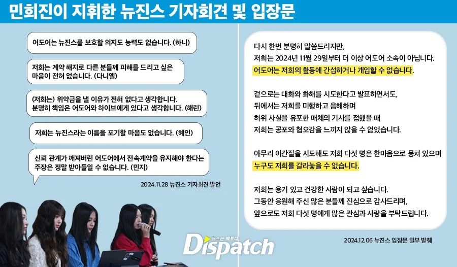 The two reportedly planned to release a statement, suggesting ADOR placed psychological pressure and anxiety on the NewJeans members, especially to attend ADOR-related activities. Dispatch claims the narrative was to build grounds to nullify the members’ contact by citing emotional distress.