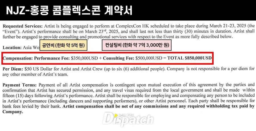 The news outlet claimed to have obtained NewJeans’ ComplexCon contract, revealing that the group received a US$850,000 payment. From that amount, US$500,000 was for consulting fees and staff expenses. Min Hee Jin reportedly discussed the contract with the members’ parents and the lawyer team. However, the creative director allegedly didn’t use her name in the contract to avoid tampering issues.