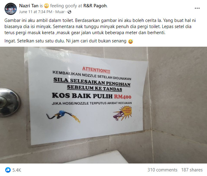 The netizen, Nazri Tan, had apparently been visiting the toilet at the petrol station at the R&R in Pagoh when he noticed a printed sign hung above the urinal. “Attention!” the sign read. “Return the nozzle after use. Please finish fueling (your car) before going to the toilet.” The sign added that the cost for repairs was RM400 if the nozzle or hose got disconnected from the fuel pump.