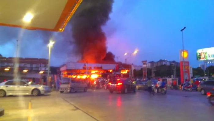 Heavy smoke could be seen from kilometres away, causing a massive traffic delay as motorists slowed down to take a better look at the fire that occurred beside the Sprint highway leading towards Damansara and Petaling Jaya from the NKVE Damansara toll plaza. The fire could have been fatal as the shops are situated 500 metres from a petrol station.