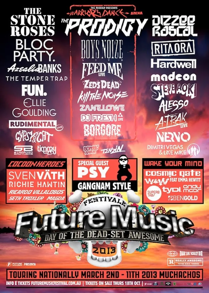 Well, we’re pretty sure banging times are ahead because Future Music Festival 2013 aka “Day Of The Dead-Set Awesome” will be bringing trance, techno, dubstep, house, electro together across two main stages and then some: