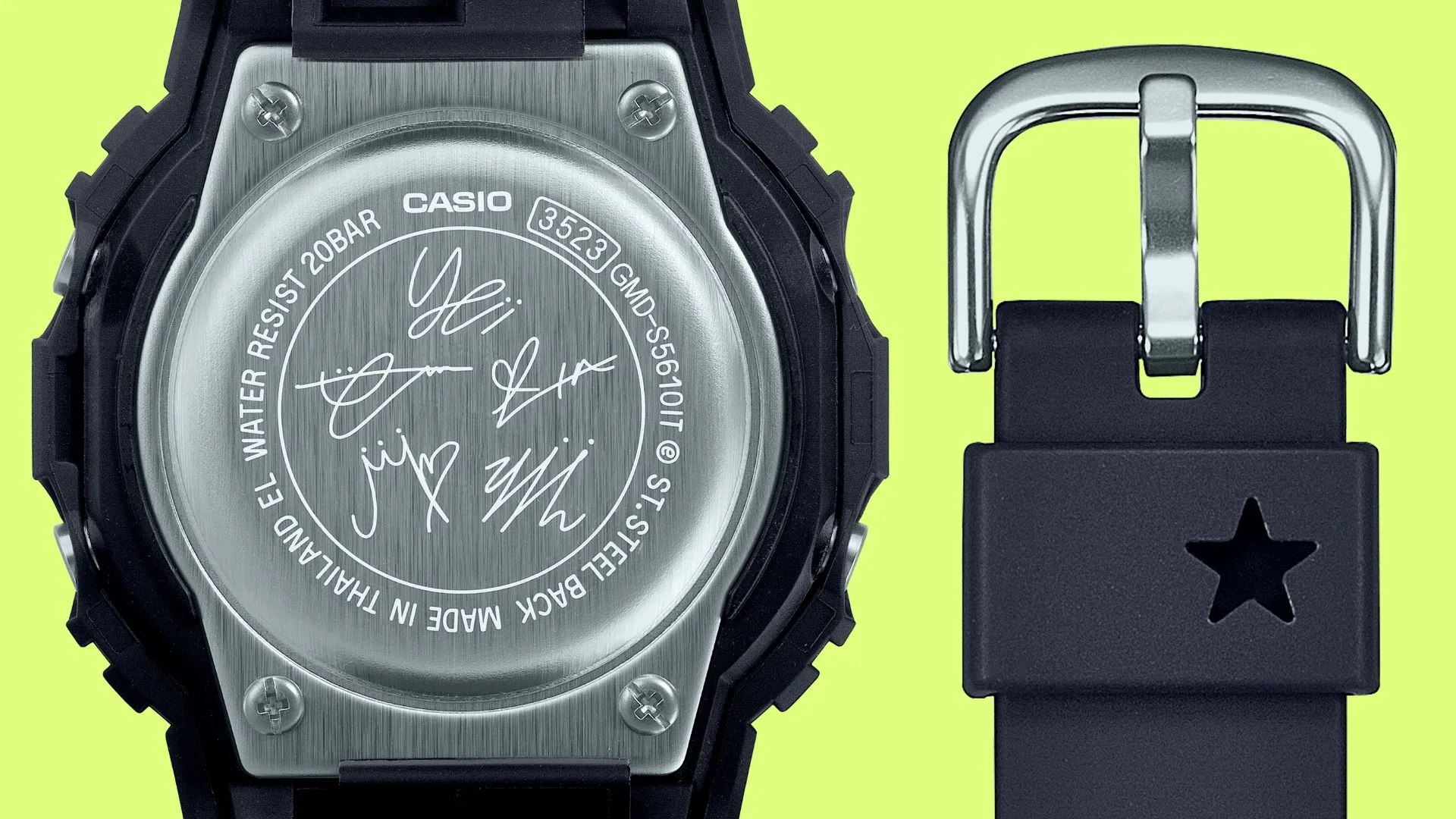 When the LED backlight is illuminated, an arrangement of hand-drawn hearts appears on the LCD, recalling the “crown pose” ITZY members make at song endings. Five stars are printed with mirror ink at the top of the face, expressing the way the five members shine on the world stage with a brightness all their own. Additional design features incorporating the ITZY worldview include engravings of each of the members’ signatures on the case back and a diecut star on the band loop matching the stars at the top of the watch face.