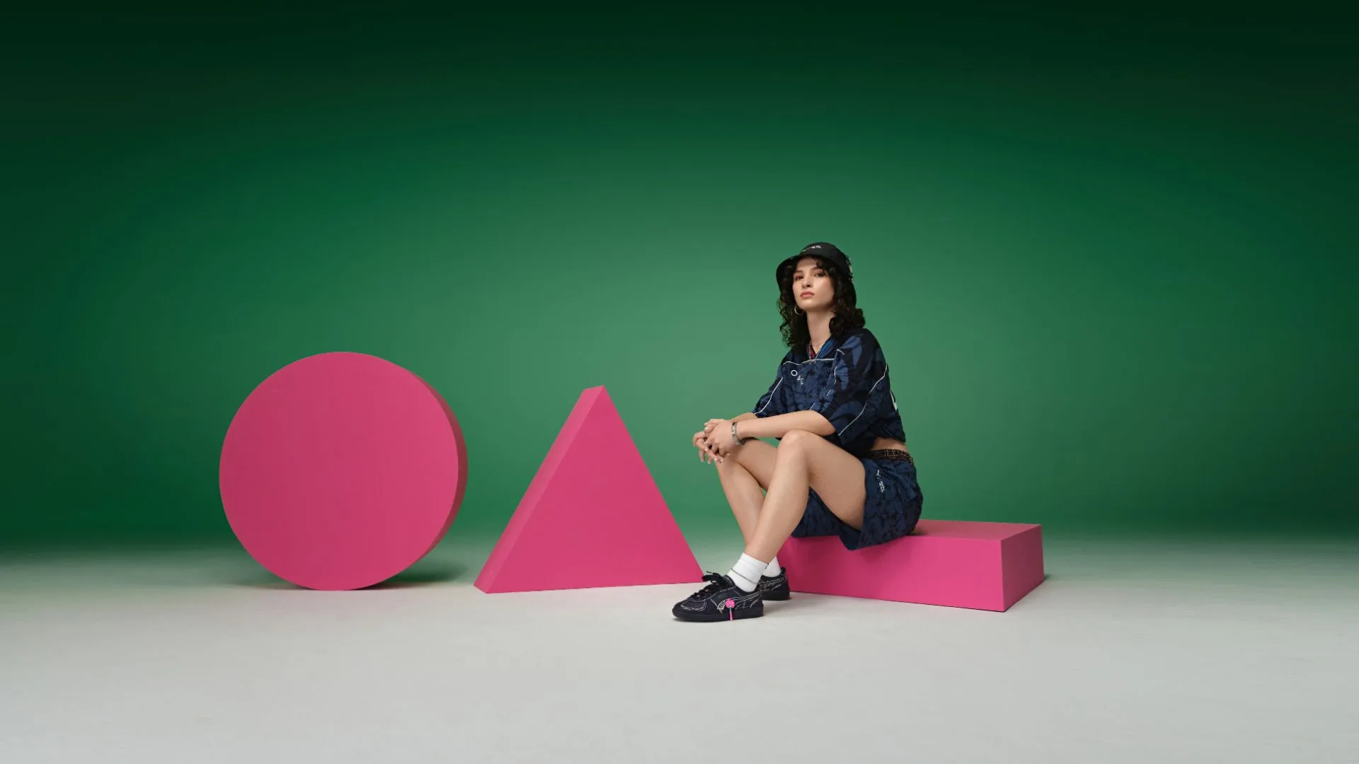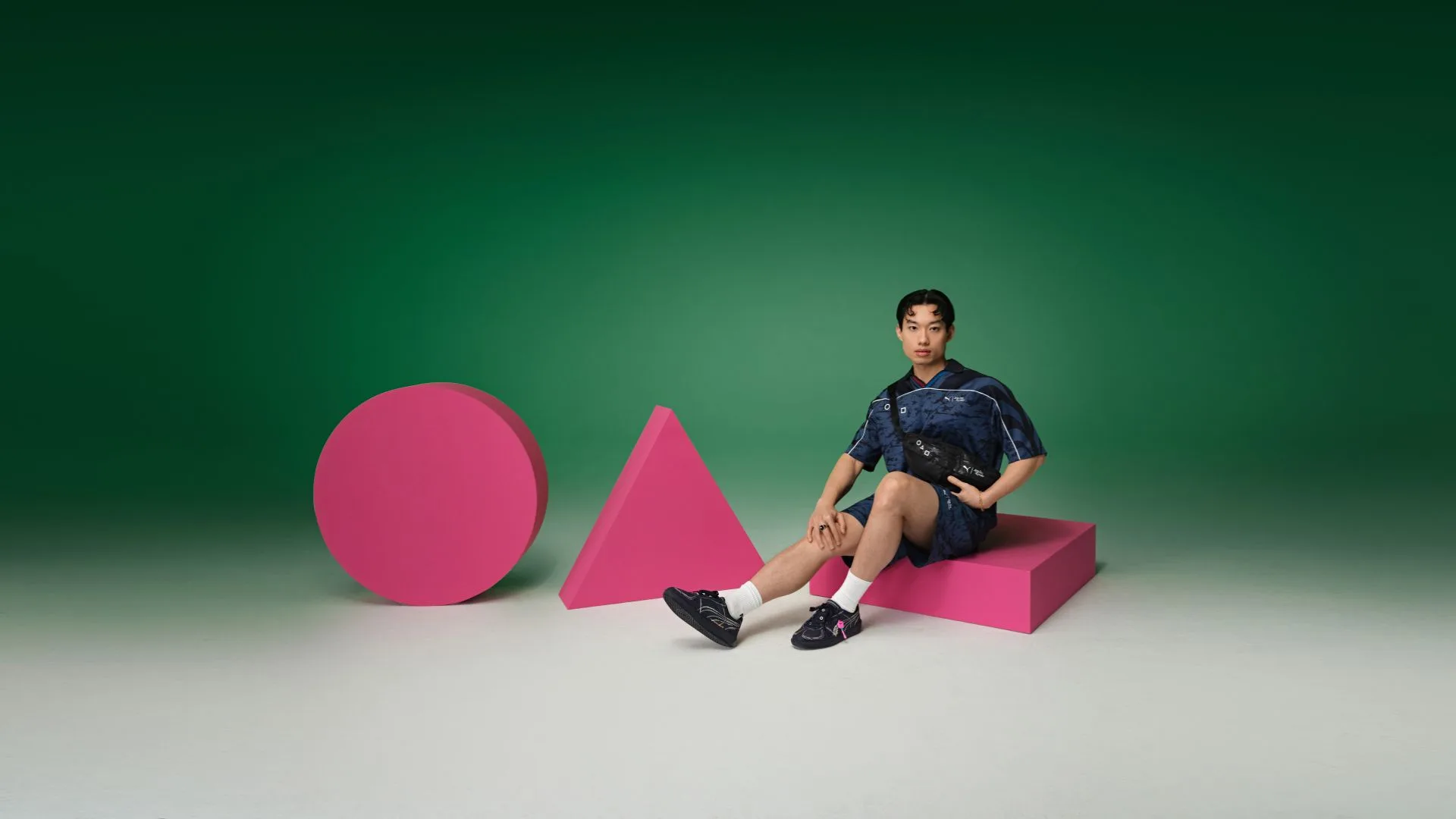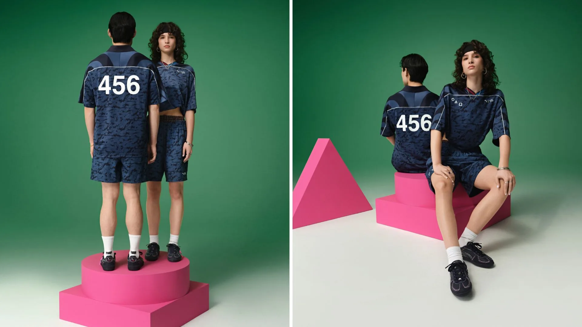 PUMA’s legacy of sportswear is interpreted through a streetwear lens, with details and accents inspired by Squid Game. The collection’s Relaxed Football Jersey and Relaxed Shorts feature an abstract all-over print, with a PUMA x Squid Game logo lockup and geometric graphics nodding to the show’s ominous masked henchmen.